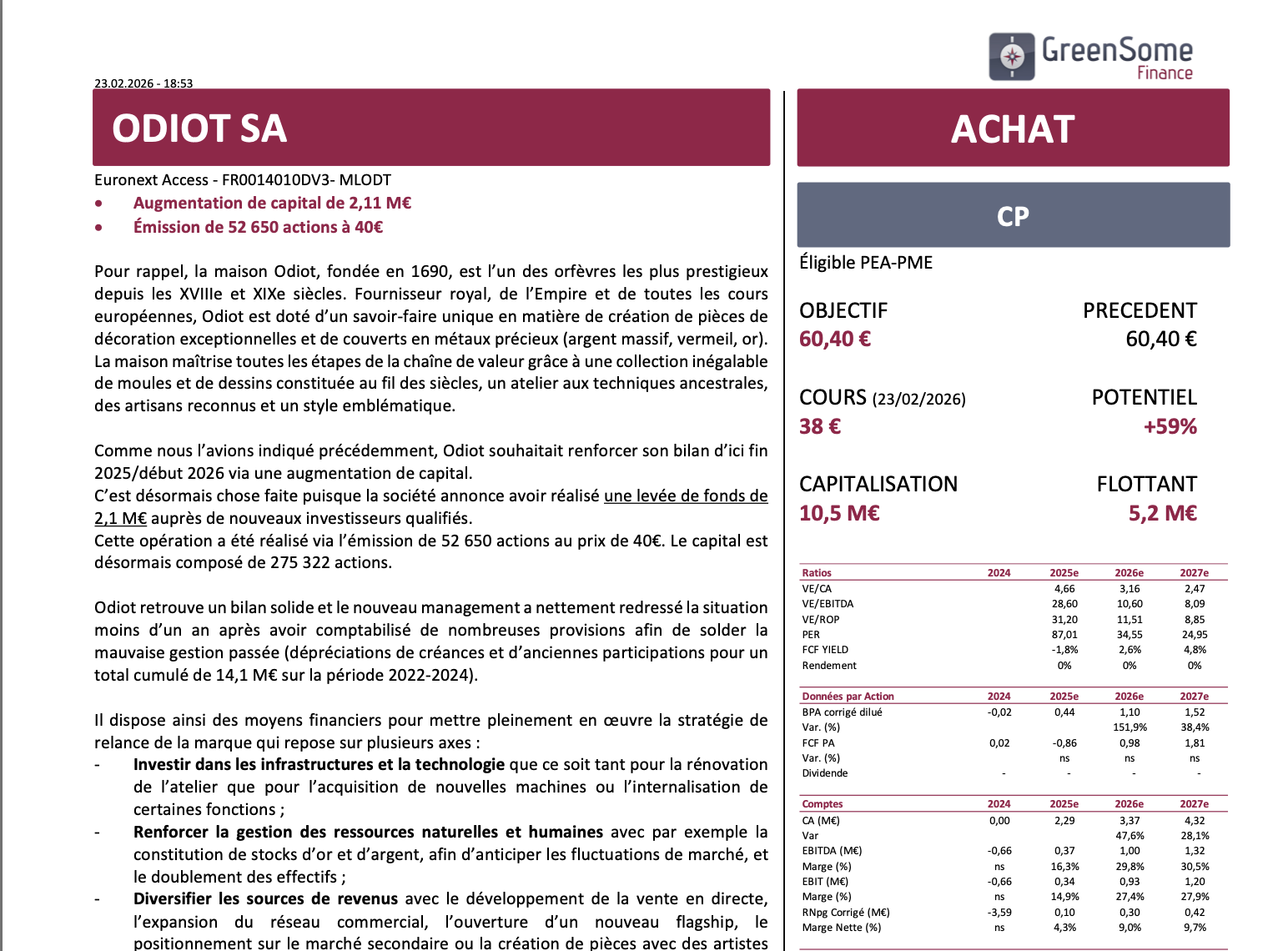 GreenSome Finance Confirms BUY on Odiot SA with +59% Upside