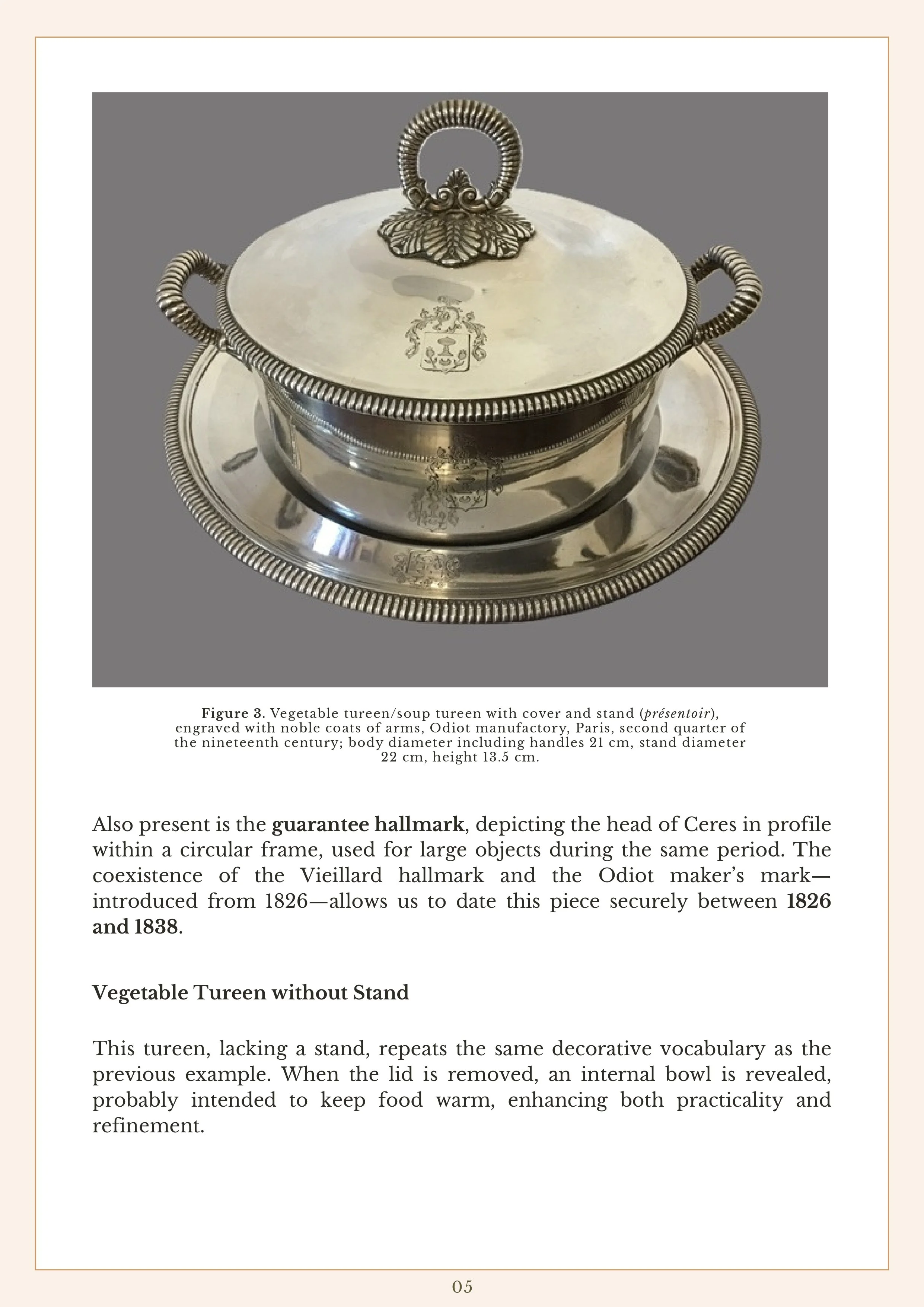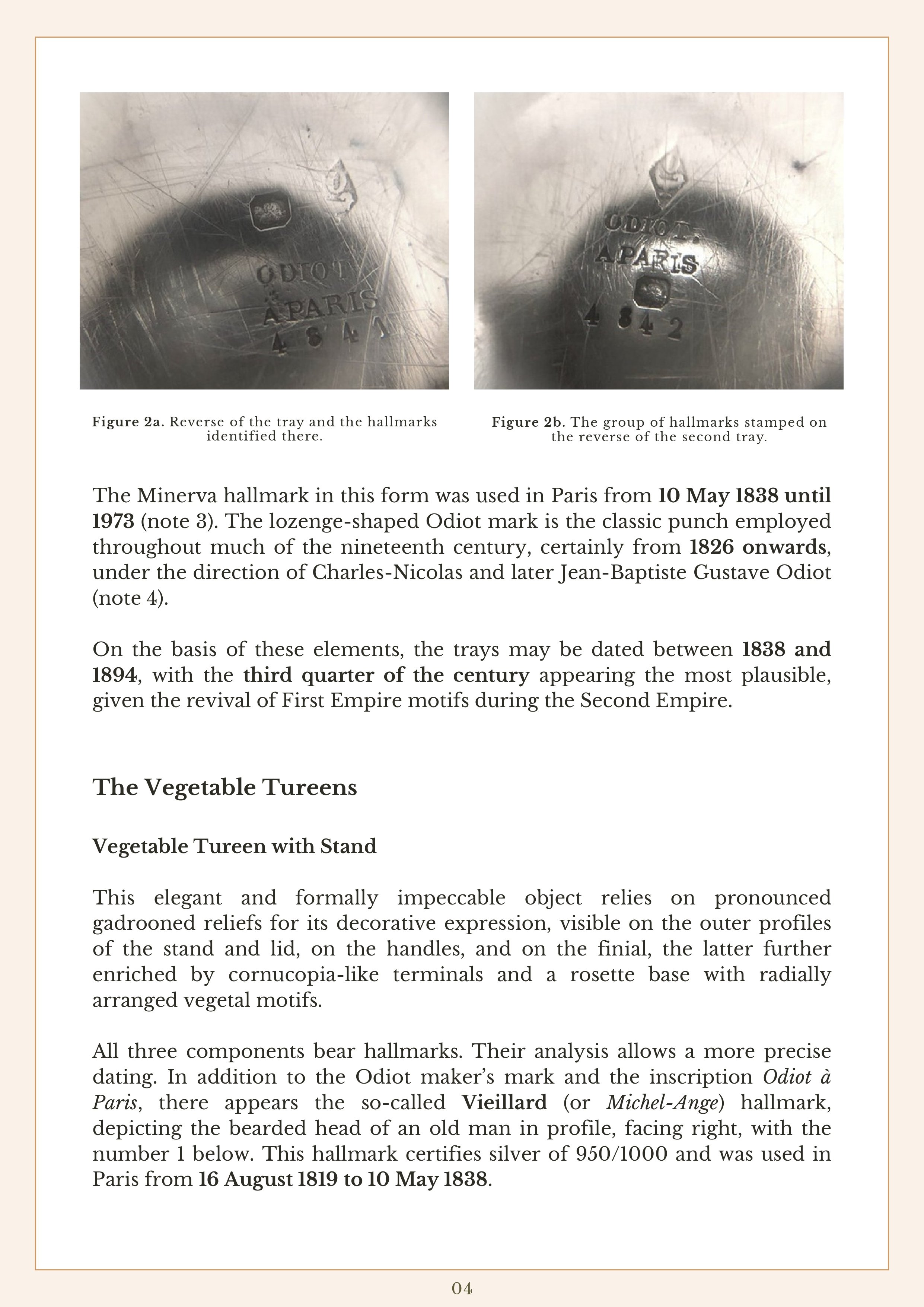 The study examines a selection of Odiot works — including trays, vegetable tureens, a coffee pot, a sugar bowl, and an écuelle with stand — and analyses their marks, inscriptions, and decorative vocabulary in order to place them within the broader chronology of the Maison’s production. It also situates these objects within the long history of the Odiot family, from its origins in 1690 to its prominence under Jean-Baptiste Claude Odiot and his successors.